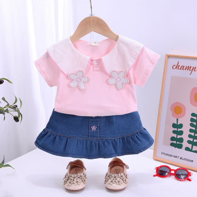 - Flower Lapel Short Sleeve With Western Style Denim Skirt Two-piece Set